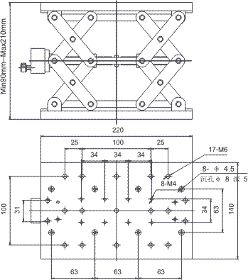 ·用于大行程,不定量,载荷大的升降调整·采用剪形升降支撑,精研丝杠驱动,双导轨五轴过定位机构,保证运动绝对平稳,舒适,精度高,承载大·上下两面多孔位设计,适用性强,均可作安装面·配有锁紧手轮,安全可靠